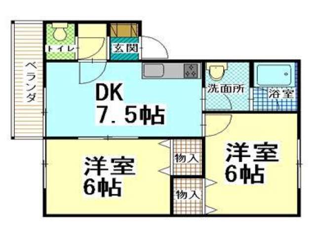 | 詳細間取 | 2DK (洋6帖×2、DK7.5帖) | ||