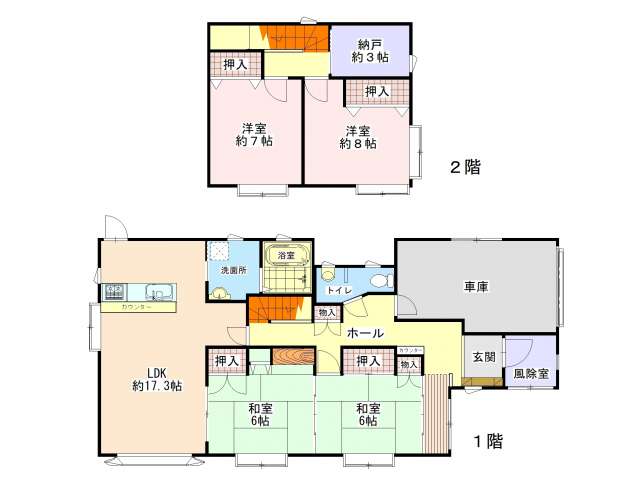 | 詳細間取 | 4LDK (1階:和6帖×2、2階:洋7帖×1、2階:洋8帖×1、1階:LDK17.3帖) | ||